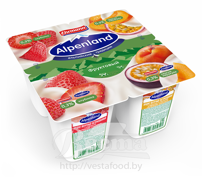 "Alpenland.Фруктовый" с клубникой/персиком и маракуйей, продукт йогуртный пастериз.,мдж 0,3%, 95г, 1/24