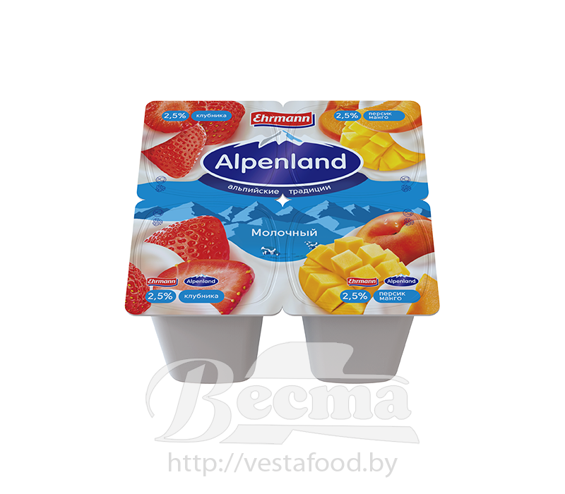 "Alpenland.Молочный" с клубникой/персиком и манго, продукт йогуртный пастериз., мдж 2,5%, 95г, 1/24