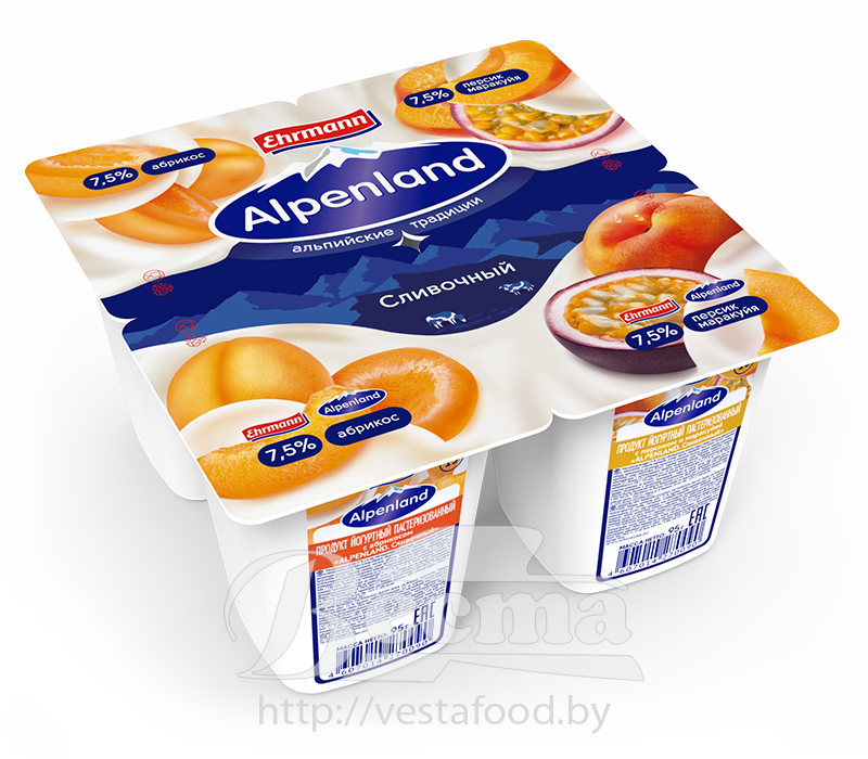 "Alpenland.Сливочный" с абрикосом/персиком и маракуйей, продукт йогуртный пастериз., мдж 7,5%, 95г, 1/24
